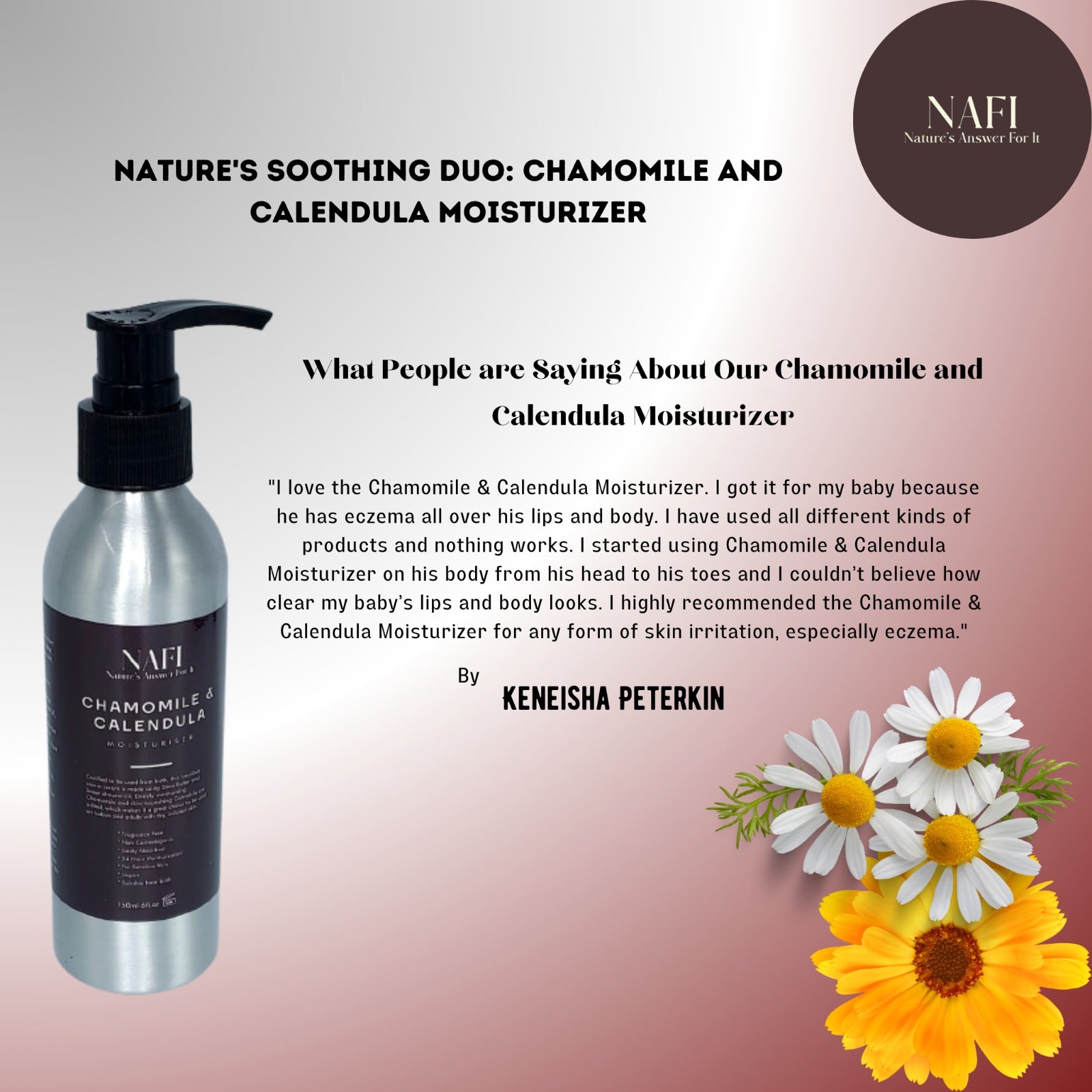 Zyzven Naturals, in partnership with NAFI, is proud to present our Chamomile and Calendula Head to Toe Moisturizer. This gentle, soothing formula is expertly crafted to cater to the delicate needs of all skin types, from newborns to adults, particularly those with dry and eczema-prone skin.
