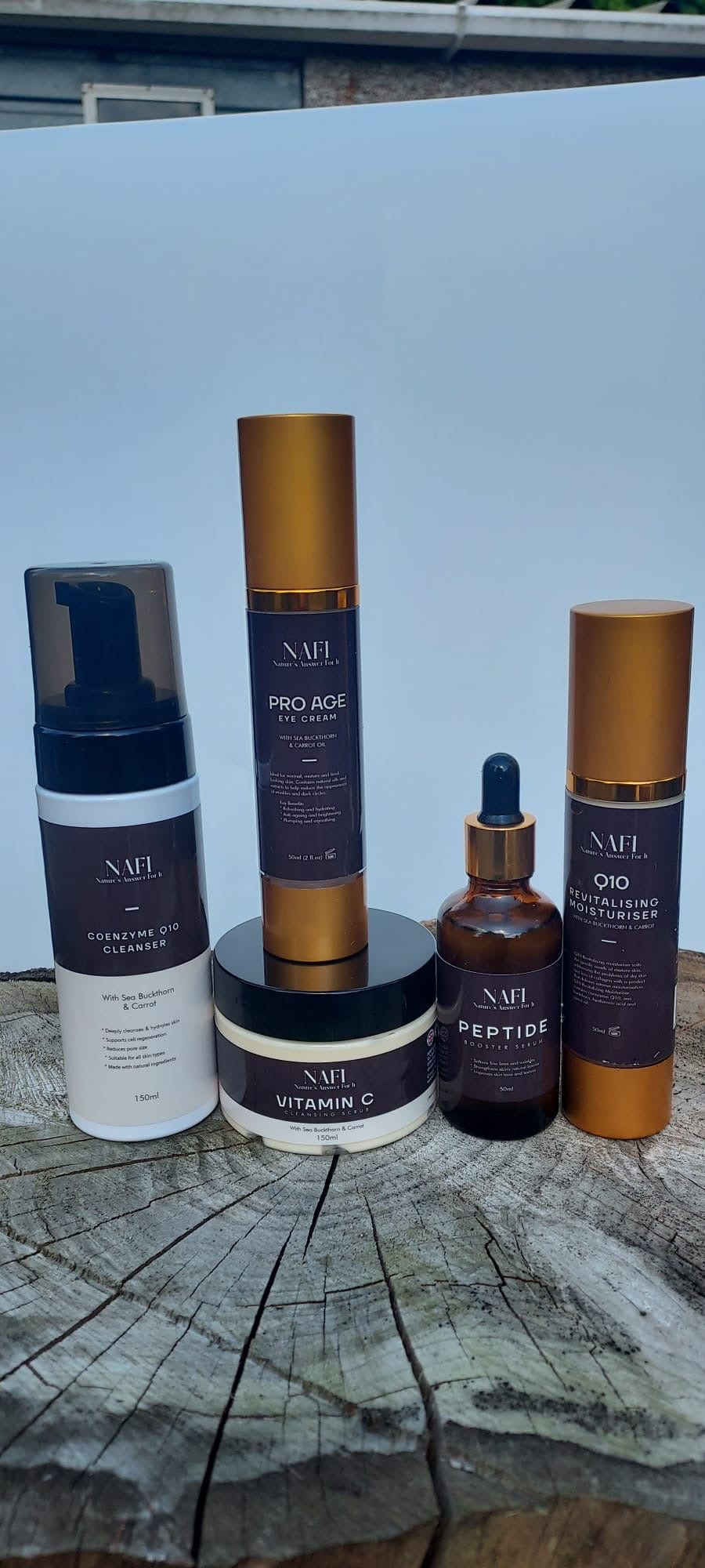 - **Evening Routine:** Use the Q10 Cream Cleanser, followed by the Rose Toning Mist. On alternate days, replace the cleanser with the Vitamin C Facial Scrub for enhanced exfoliation. Continue with the Peptide Booster Serum and Proage Eye Cream, and conclude with the Q10 Moisturiser.