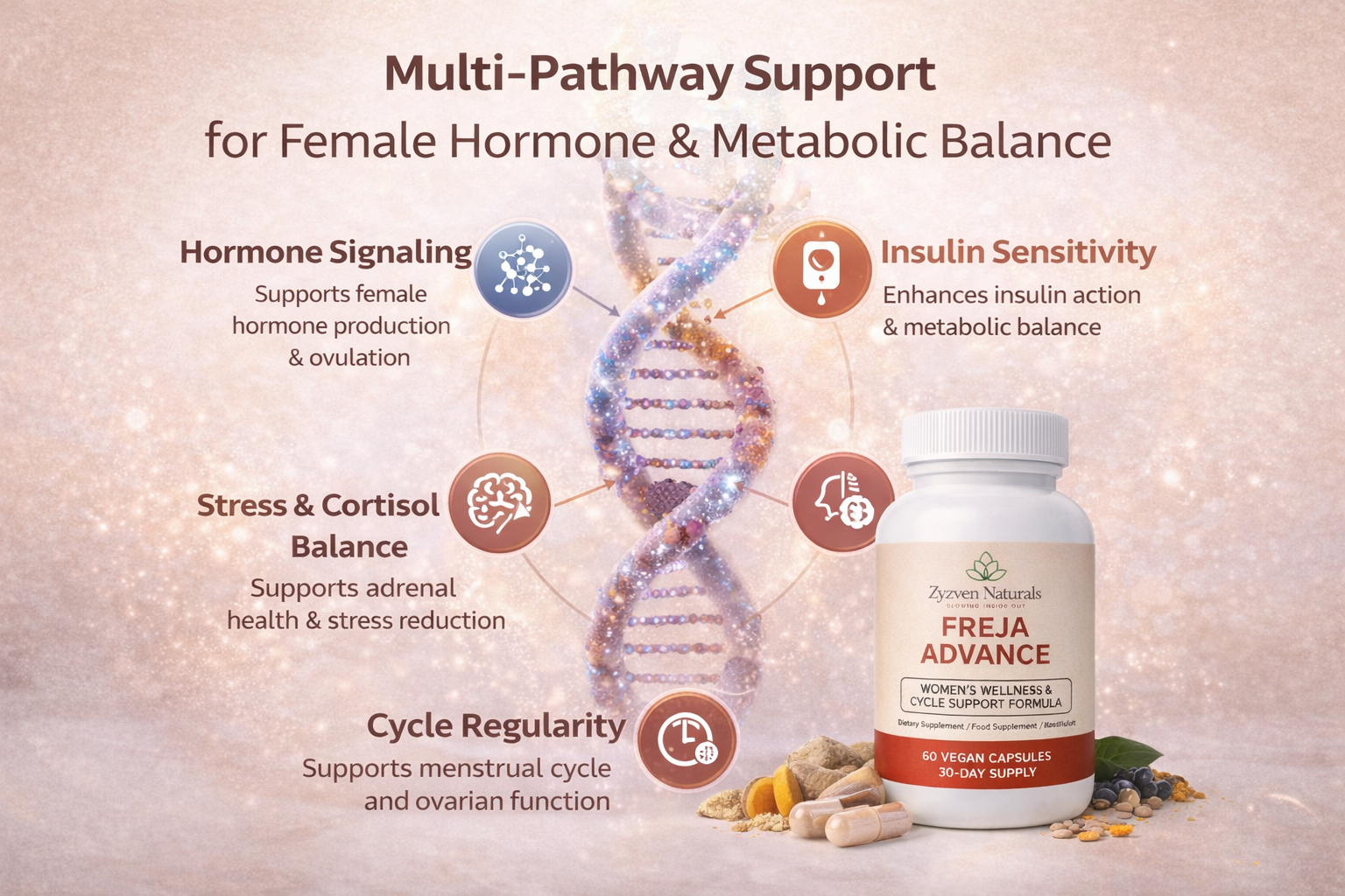 Freja Advance is a premium female hormone and metabolic support food supplement designed to support normal hormonal balance, insulin sensitivity, cycle regularity, ovulation and reproductive wellness.