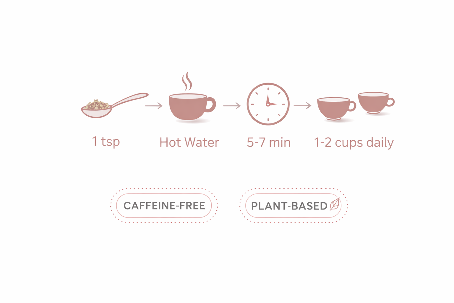 Add 1–2 teaspoons of loose leaf tea per cup. Pour over freshly boiled water and steep for 5–7 minutes. Enjoy warm or cold. Suggested use: 1–2 cups daily. Make this your 10-minute daily reset.